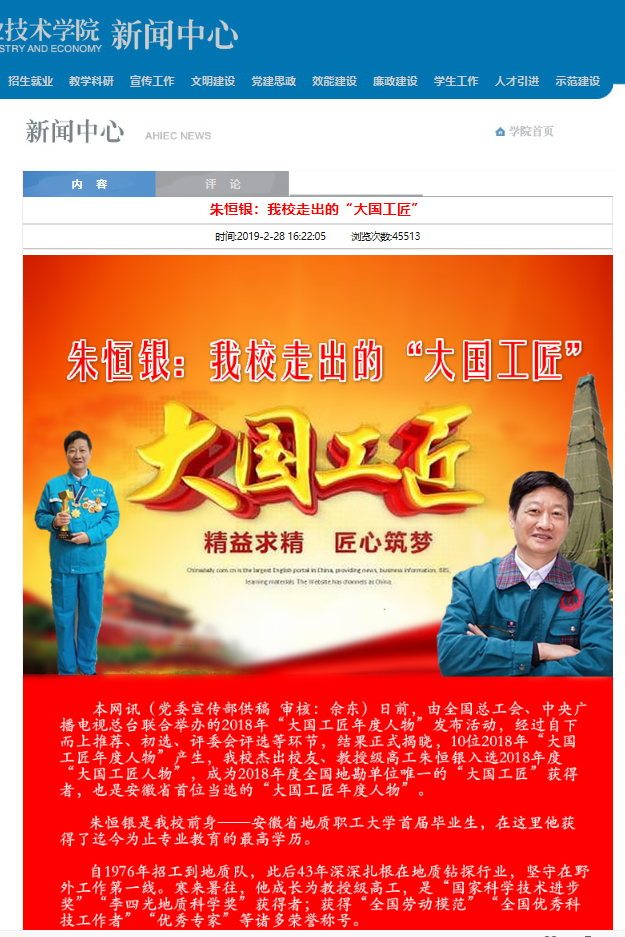 (1)安徽工业经济职业技术学院首届毕业生朱恒银,大国工匠年度人物、全国劳动模范、全国道德模范。