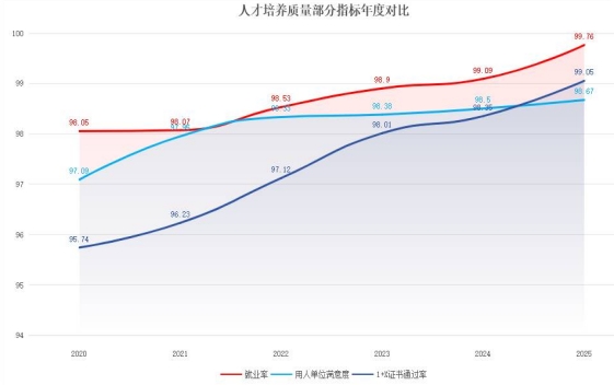 三是完善保障机制,提升人才赛训培养实效。组建由2名省级教学名师、3名省级教坛新秀领衔的“双师型”指导团队,联动企业导师开发竞赛备战指南,将竞赛成果转化为课程案例20余个。推行“赛训学分置换”制度,竞赛获奖兑换实践学分,近2000名学生通过“课赛证”融合路径获得数智化技能证书,职业技能水平与岗位适配度显著提升。