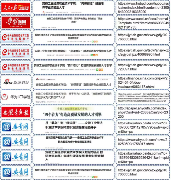 人民日报、学习强国、安徽日报、安青网等国家与省级媒体报道成果近20次。安徽卫视对学校成果进行专访,学习强国安徽学习平台以《安徽工业经济职业技术学院:深耕产教融合 推动校企“双向奔赴”》为题、人民日报以《中高职一体化合作办学 赋能地方技能人才培养》为题、中国教育新闻网以《安徽工业经济职业技术学院:“岗课赛证”融通培养专业技能型人才》为题、安徽教育报以《数智化人才培养服务地方产业》为题、安徽青年报以《安徽工业经济职业技术学院“四个着力”打造高质量发展的人才引擎》为题、安青网以《从“菜鸟”到“领头雁”——职业技能赛场显身手》《数智引领产教融合新飞跃-安徽工业经济职业技术学院大数据与会计专业群改革纪实》为题对成果进行了广泛报告,受社会广泛关注。