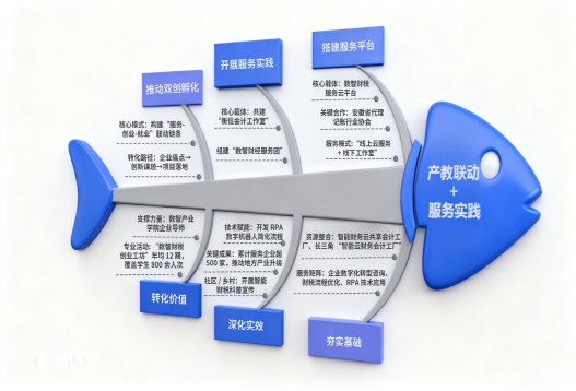 一是搭建数智化社会实践服务平台,夯实服务基础。联合安徽省代理记账行业协会共建“数智财税服务云平台”,整合智能财务云共享会计工厂、长三角“智能云财务会计工厂”等资源,打造“线上云服务+线下工作室”相结合的服务载体,形成覆盖企业数智化转型咨询、财税流程优化、RPA技术应用等领域的服务矩阵。