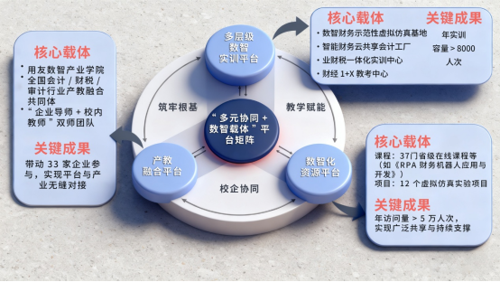 二是共建产教融合平台,深化校企协同。与用友共建数智产业学院,构建“政府-行业-企业-学校”四方联动的“1+1+N”实践教学体系,打造全国会计行业产教融合共同体,组建“企业导师+校内教师”双师团队,带动33家财税服务企业参与人才培养。