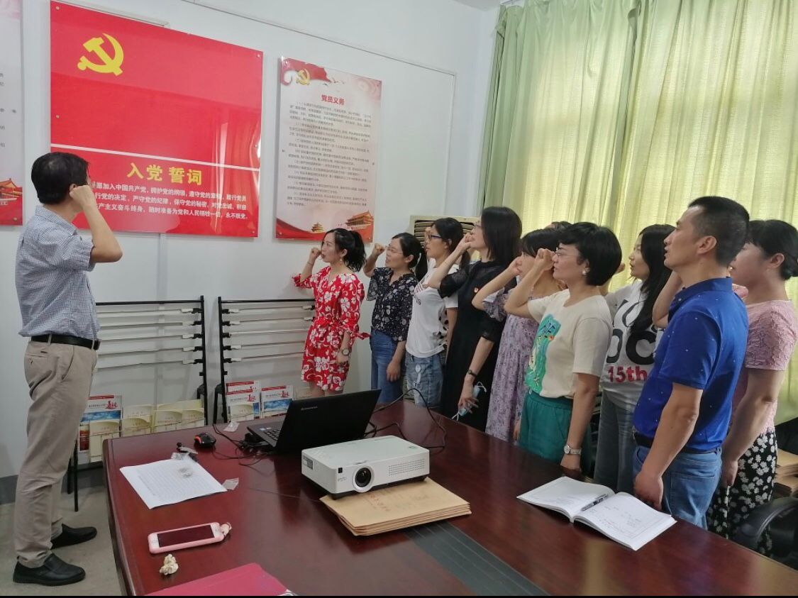 随后,史召峰同志带领全体党员教师重温入党誓词。全体党员教师面对鲜红的党旗举起右手,庄重地重温了对党庄严而神圣的誓言。