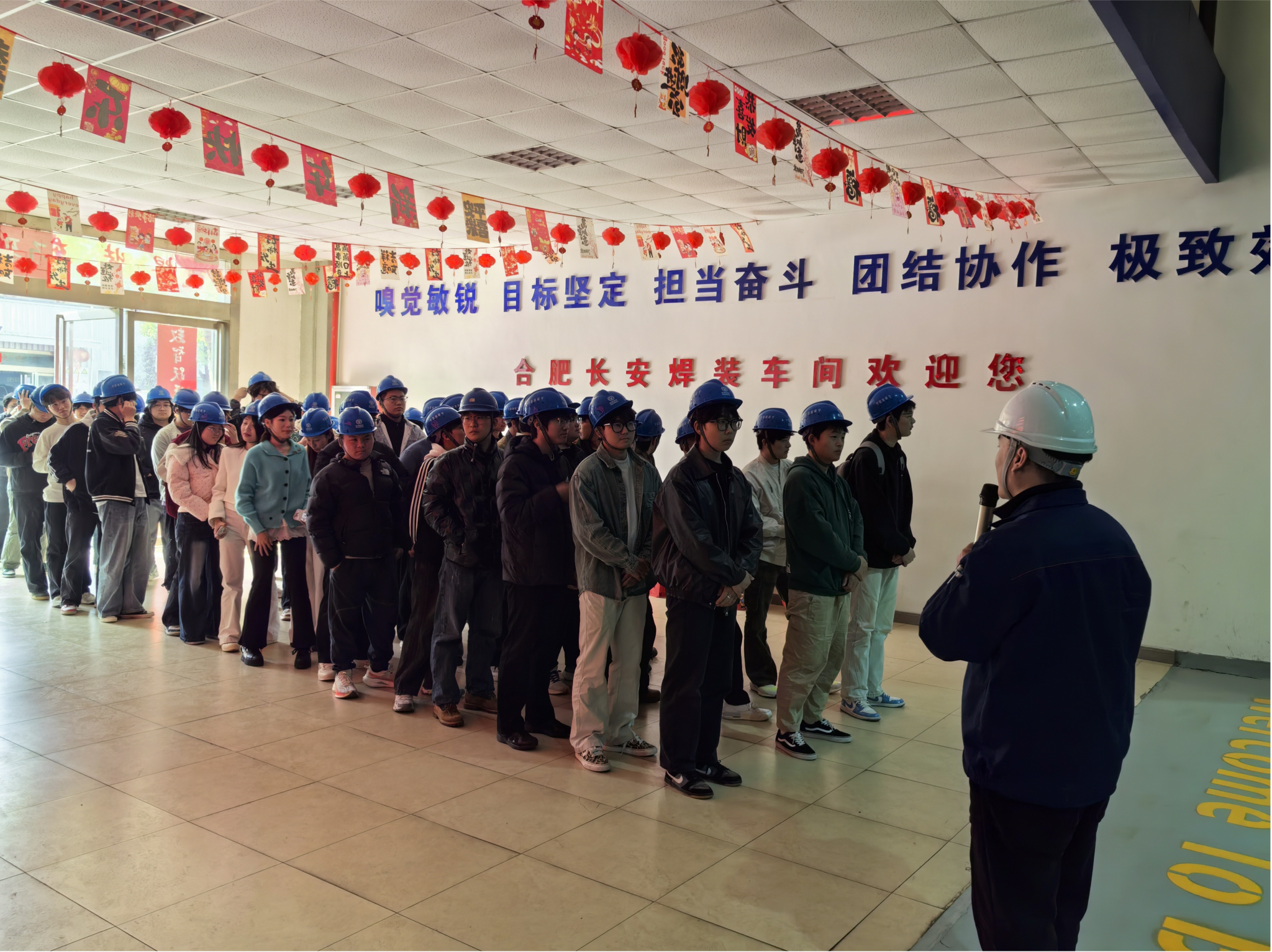 在合肥长安汽车有限公司相关工作人员的引导下,学生们首先走进焊接车间,偌大的厂房内,自动化生产线高效运转,工业机器人手臂精准舞动。企业技术人员详细讲解了车身焊接工艺、自动化设备应用及质量控制体系,让同学们对“智能智造”背景下的汽车制造前端核心工艺有了直观而深刻的理解。在总装车间,一道道工序紧密衔接,呈现出一派繁忙而有序的景象。沿着参观通道,同学们认真观摩了车辆从零部件到整车下线的完整装配流程,并不时就装配工艺、物料配送、质量检测等问题与现场工作人员互动交流。