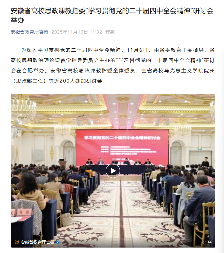 【媒体转载】安徽省教育厅官微:安徽省高校思政课教指委“学习贯彻党的二十届四中全会精神”研讨会举办