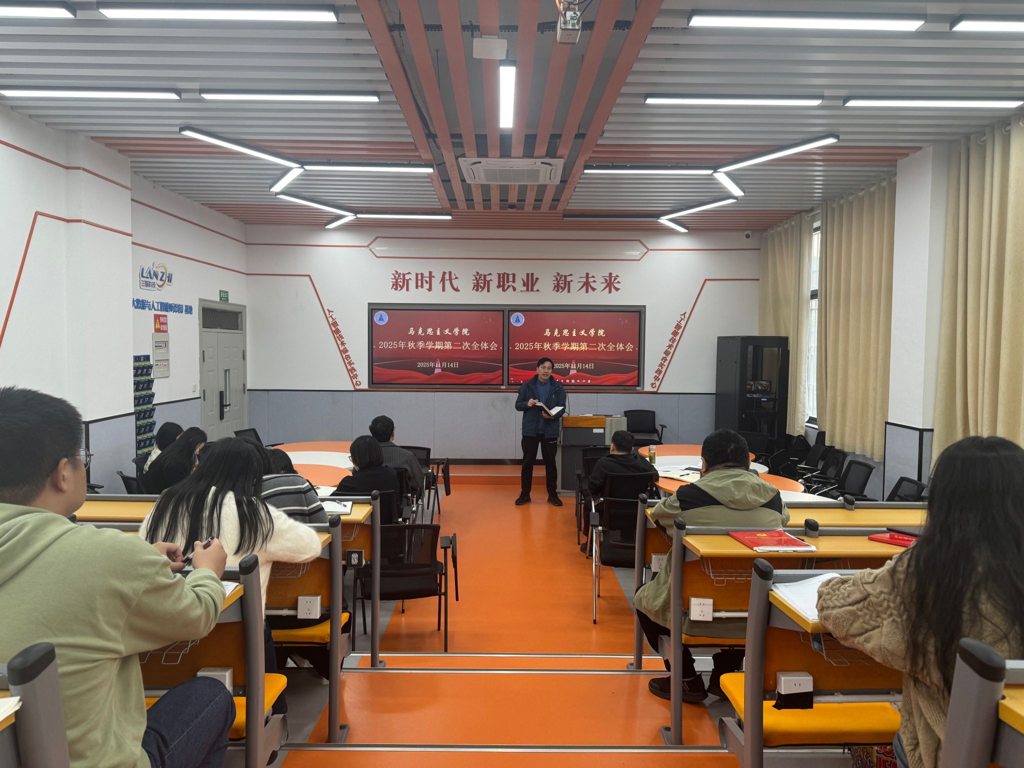 本网讯(马克思主义学院:徐强 审核:刘仁三 葛军)11月14日下午,我院召开2025-2026学年第一学期第二次全体会议。马克思主义学院院长刘仁三主持并通报部署有关工作,全体思政课教师参加会议。