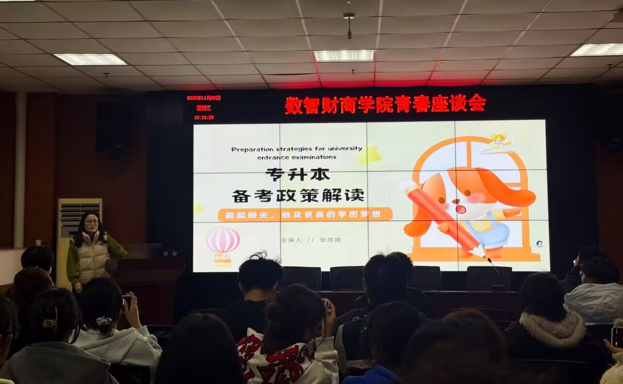 2025年11月28日,数智财商学院于主教810成功举办“青春引航,榜样面对面——大赛及专升本经验分享会”主题座谈会。本次活动聚焦立德树人根本任务,通过优秀学子的经验传承,为在校生在专业技能竞赛与学历提升方面提供精准指导,助力构建积极向上的校园学风生态。