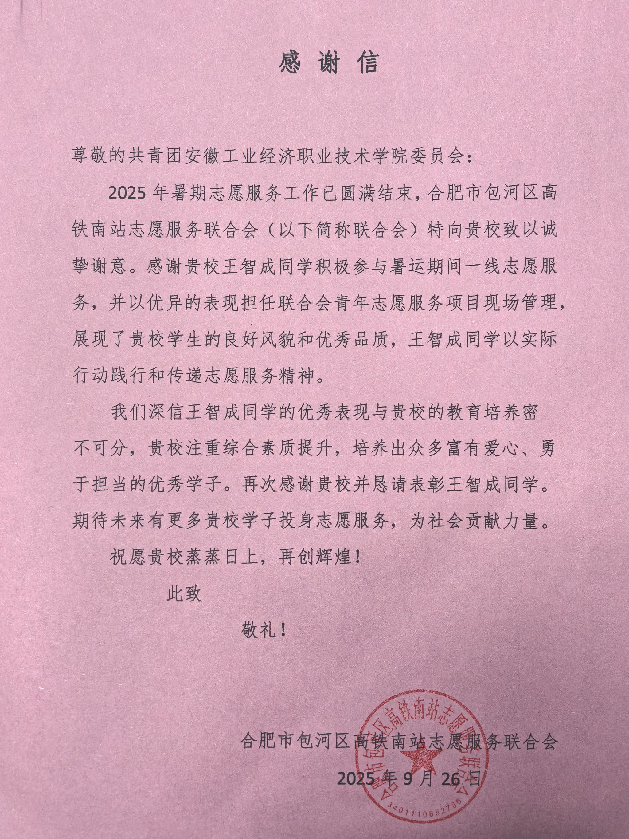 (编辑:校团委融媒体 初审:吕雪瑛 复审:周正 终审:王俊)近日,一封来自合肥南站的感谢信送至我校,这封信对我校计算机与人工智能学院2024级王智成同学在暑期志愿服务中的突出表现予以高度赞扬和诚挚感谢。王智成在合肥南站期间的暖心服务与无私奉献,生动展现了我校学子的青春风采与责任担当。