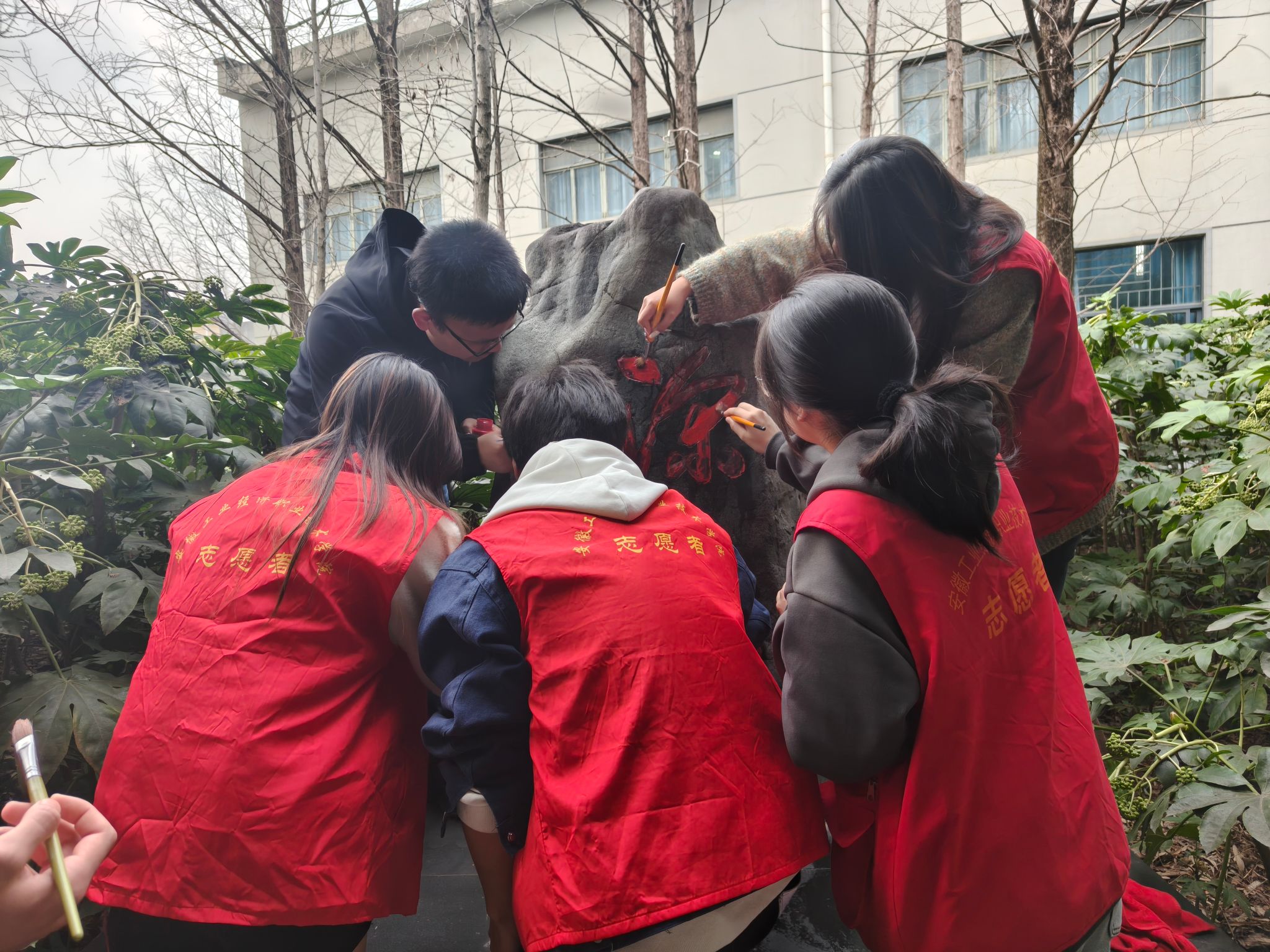 活动现场,王俊率先垂范,手持画笔,认真细致地为石头上的字迹勾勒轮廓、填充色彩。同时,他还不忘跟团员青年们分享朱恒银教授作为大国工匠年度人物的不凡事迹。同学们纷纷拿起工具,全神贯注地投入到描红工作中。大家一边描红,一边交流着朱恒银教授的先进事迹。朱教授作为学校首届毕业生,凭借着不懈的努力和钻研精神,在地质勘探领域取得了卓越成就,他的奋斗历程激励着每一位在场的师生。