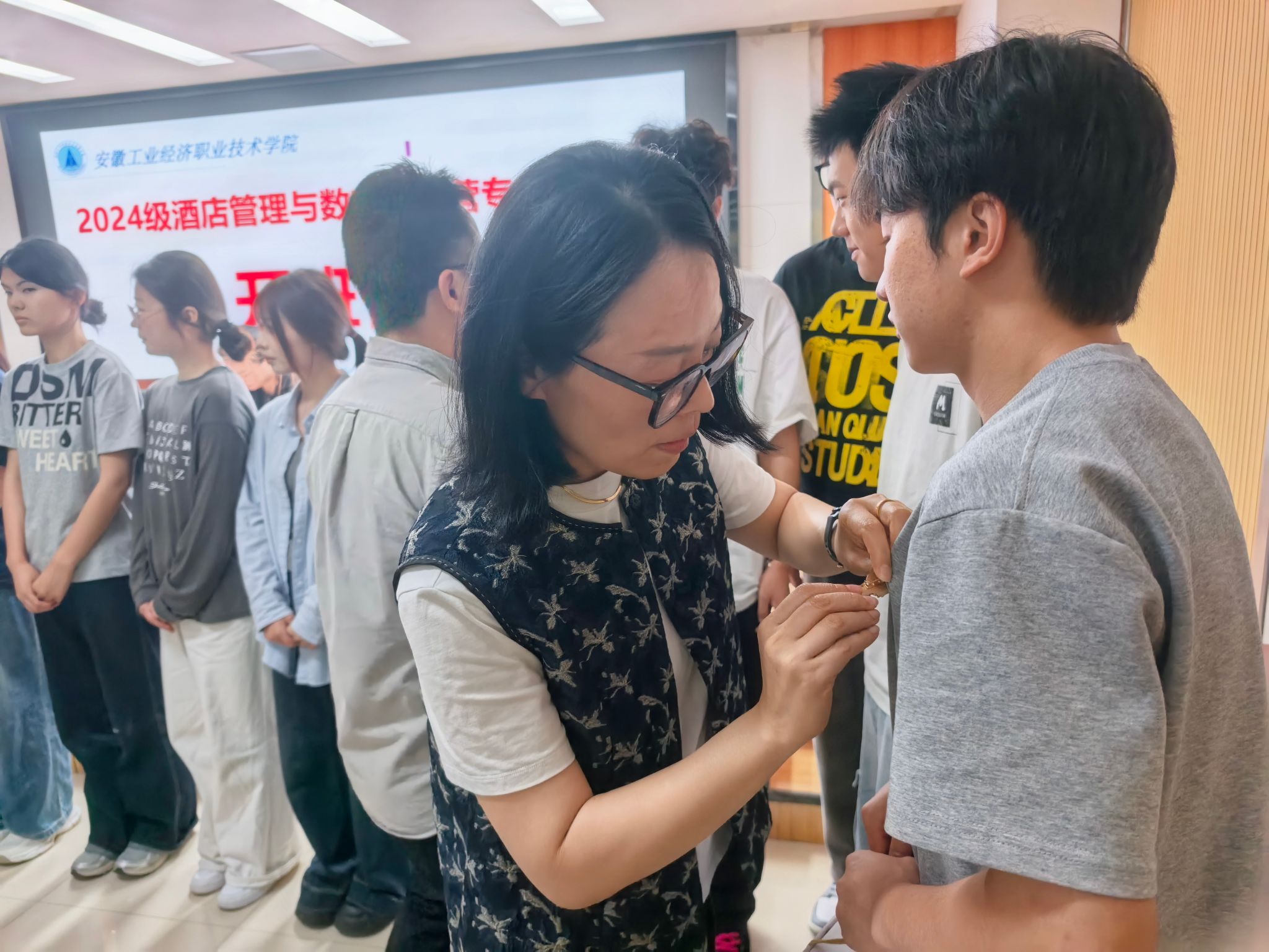 仪式现场,校企双方签署了《订单班合作协议》,并进行了充满仪式感的徽章授予和颁发入班礼活动,企业代表和领导老师现场为订单班同学们佩戴徽章,同学们昂首挺胸,轻抚胸前的徽章,纷纷感慨戴上徽章,仿佛触摸到了行业的脉搏,将以今日为起点,努力成长为兼具温度与智慧的新时代酒店人。