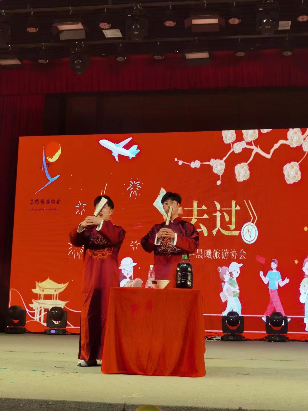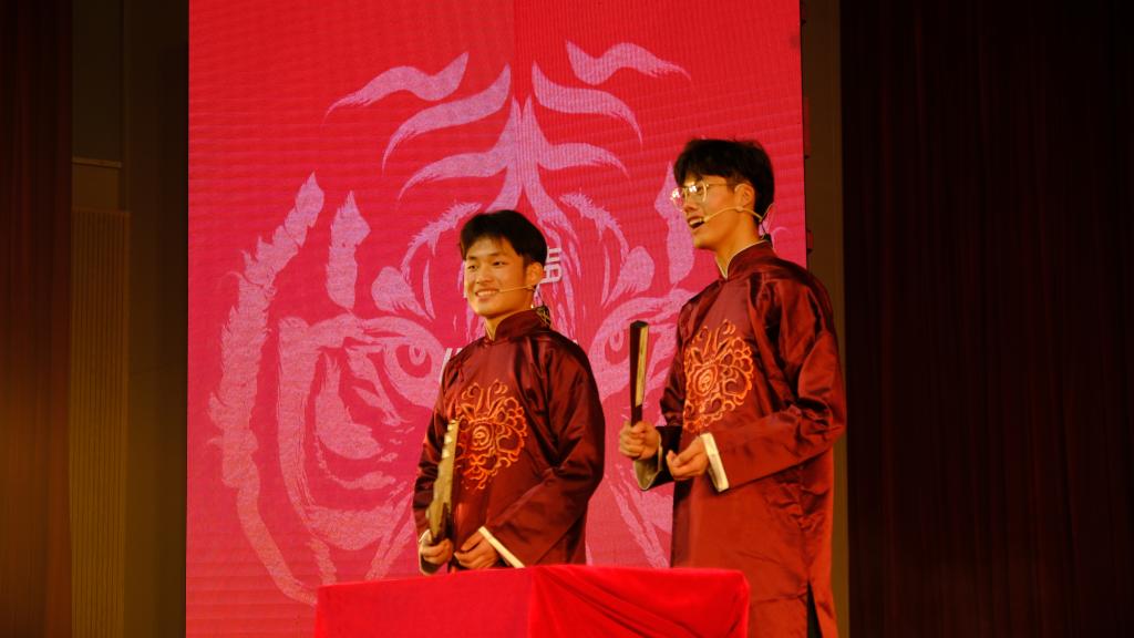 其中来自旅游管理学院晨曦旅游协会2021级两位干事自编、自导、自演相声《去过》,生动有趣的展现了中国地域广博,地区文化的差异,且突出了旅游管理专业特色。这个节目极大符合了学院文化特色。两位相声的演员的生动表演,也使得台下观众们开怀大笑,赢得阵阵掌声。节目结束时,两位相声演员代表晨曦旅游协会,向每一位师生发出最真挚的祝福:预祝大家新年快乐!身体健康!万事如意!