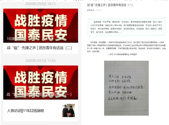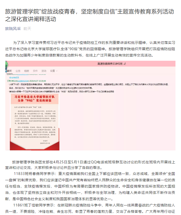 为了深入学习宣传贯彻习近平总书记关于疫情防控工作的系列重要讲话和批示精神,认真关切落实习近平总书记给北京大学援鄂医疗队全体“90后”党员的回信精神。旅游管理学院组织开展把打赢疫情防控阻击战作为加强青少年制度自信教育生成教科书在线上广泛开展生动有效的宣传交流活动。