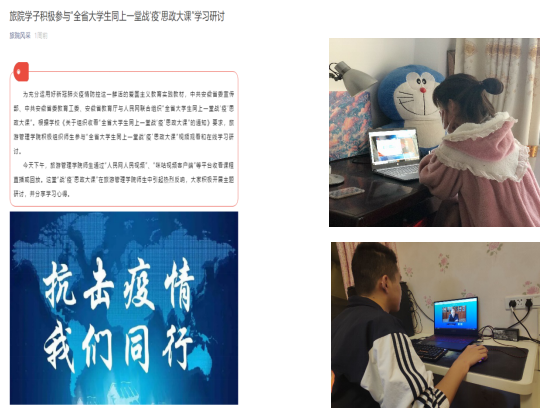 4月23日下午2:30分,根据学校《关于组织收看“全省大学生同上一堂战‘疫'思政大课”的通知》要求,旅游管理学院共有24个班级在线上开展了同上一堂战疫思政大课的活动。本次课程由网课形式展现,通过这种形式既丰富了同学们有关疫情的相关知识,又感受到了线上教学带给我们的便利。总体来说,此次我院同上一堂战疫思政大课学习研讨非常有意义