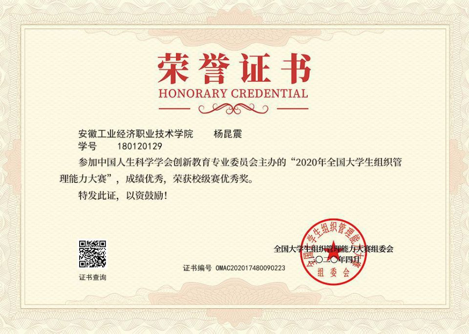 本次组织管理能力竞赛是由中国人生科学学会创新教育专业委员会举办,旅游管理学院团总支作为协办单位,积极组织和鼓励学生参与其中。通过线上实名制进行答题,只要成绩合格就会获得相应电子版证书。在团总支的组织下,我院共有354位学生完成线上答题,其中179位学生获得2020年全国大学生组织管理能力大赛荣誉证书。