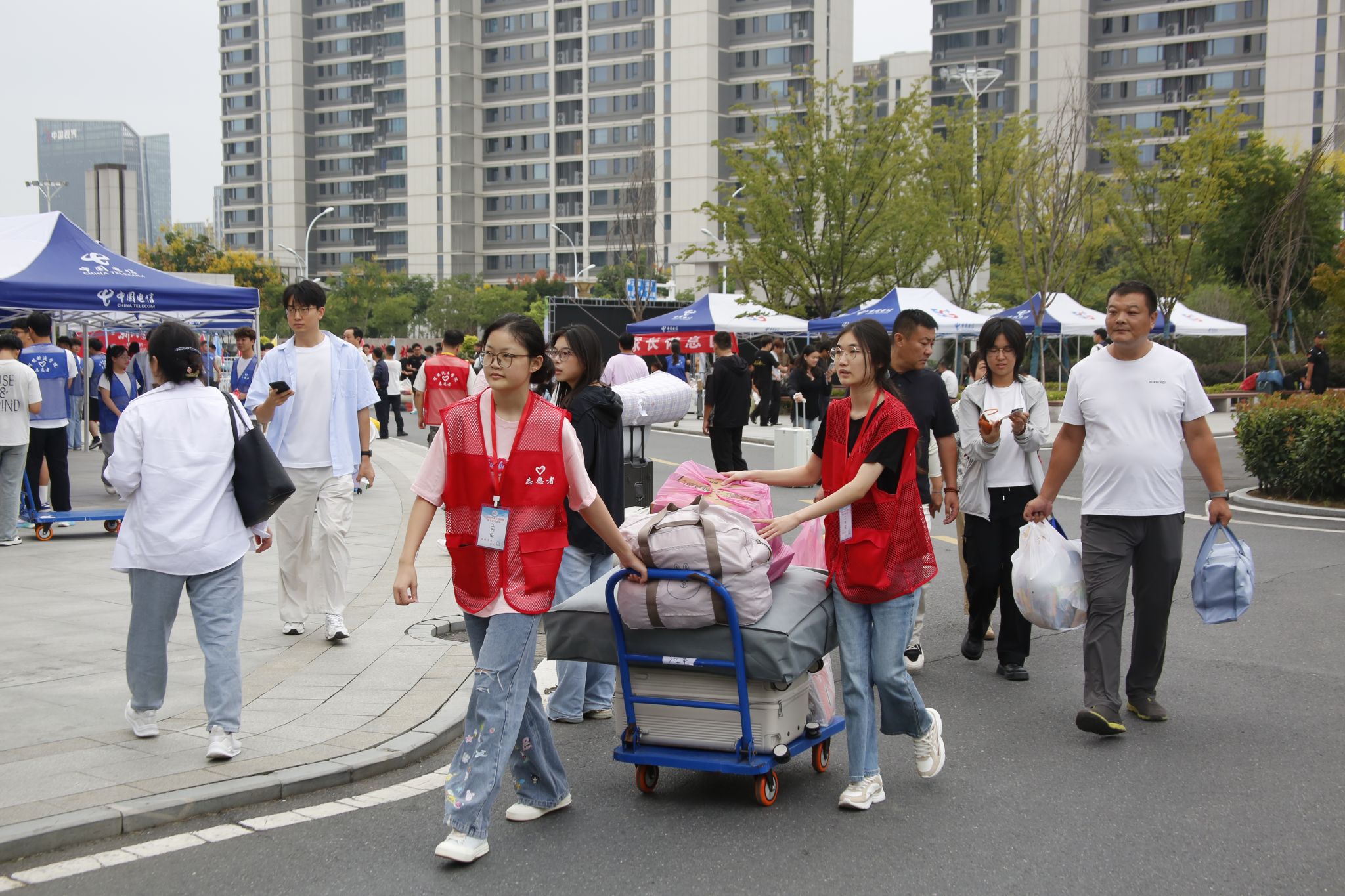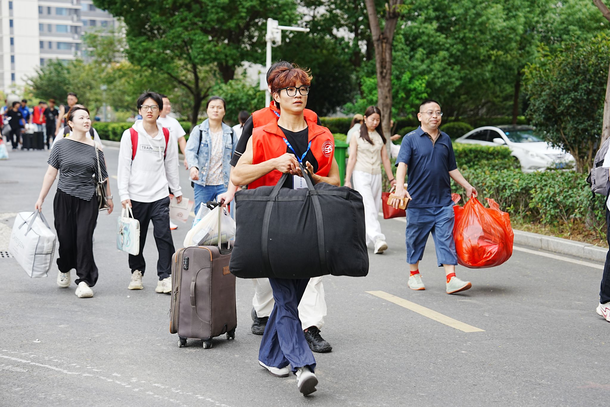 报到当天,校园里处处洋溢着热烈而温馨的氛围,各二级学院报到点一早就已准备就绪。南大门前车流有序,人流如织,身穿各色志愿服的同学们在校园内外忙碌地穿梭,从车站接站到入口引导,从行李搬运到入住协助,他们用热情的笑容和细致的服务温暖着每一位初来乍到的新生与家长。今年,学院共组织校院两级志愿者700余人,他们成为迎新工作中最动人的“青春名片”。