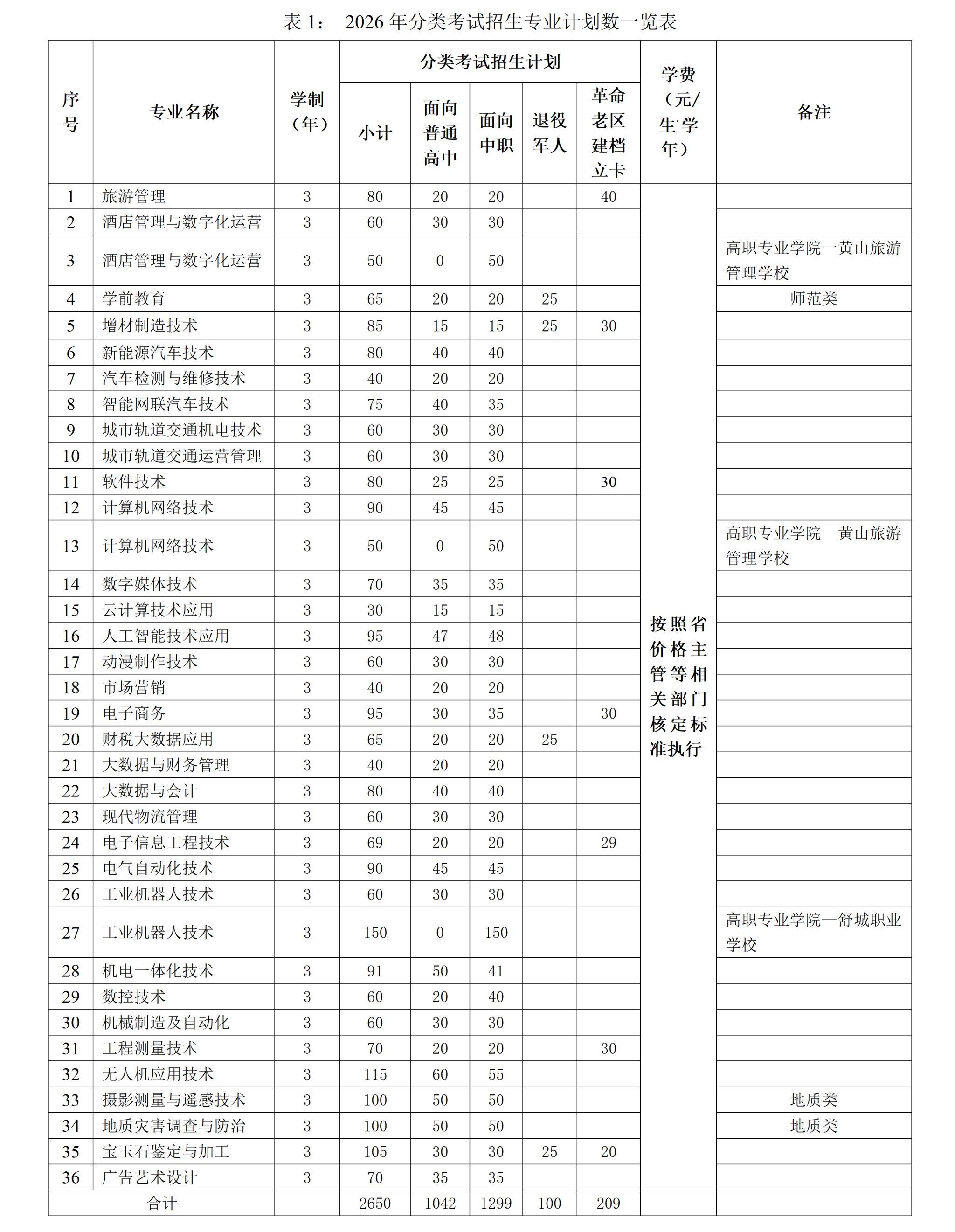 六、招生专业及计划:我院2026年分类考试招生总计划2650人,各专业均不限历史和物理科目,统一录取。