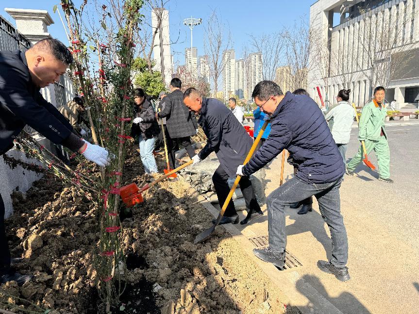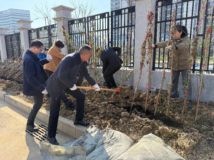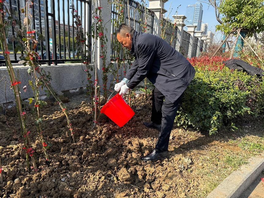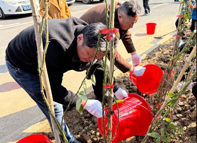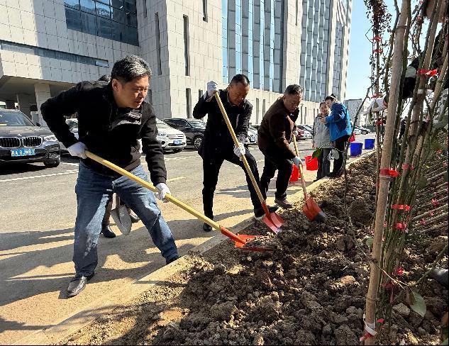 上午9时,校企双方党员职工代表在学院南门东侧围墙处栽种爬墙月季,从挖穴、回填、施肥、种植到浇水,大家争先恐后,辛勤劳动,将校园越变越美的祝愿一同种植到脚下的泥土中。完成所有花苗的种植后,大家开心地表示,等到灿烂如霞的月季爬满栅栏时,一定要到这里拍照“打卡”留念。