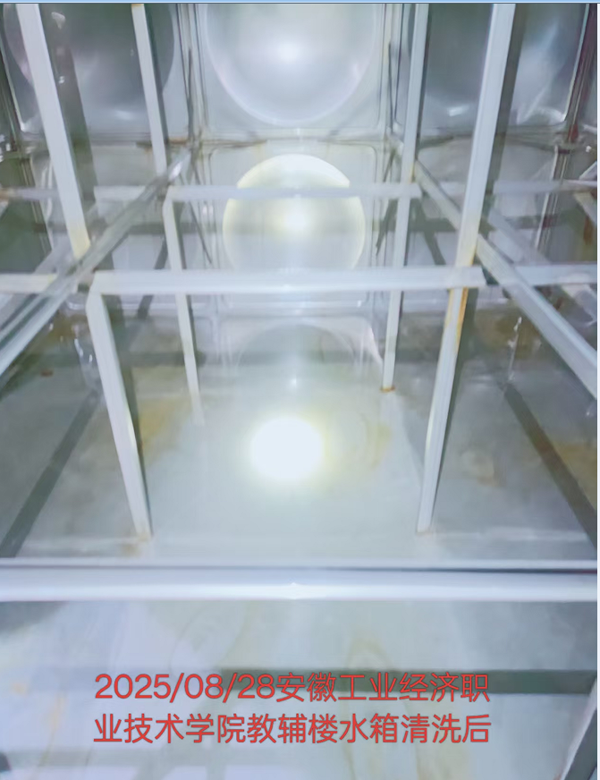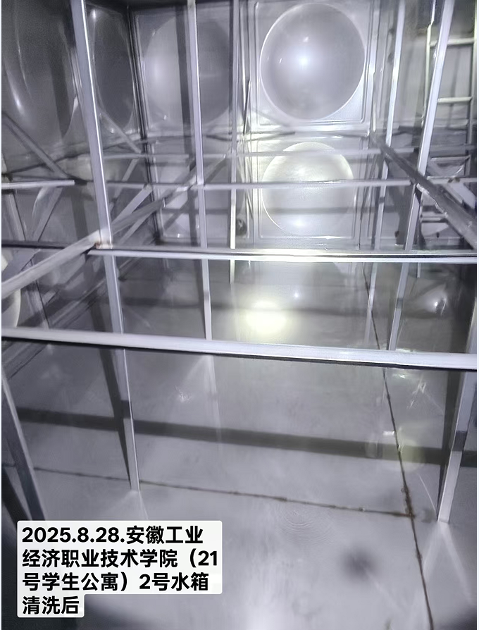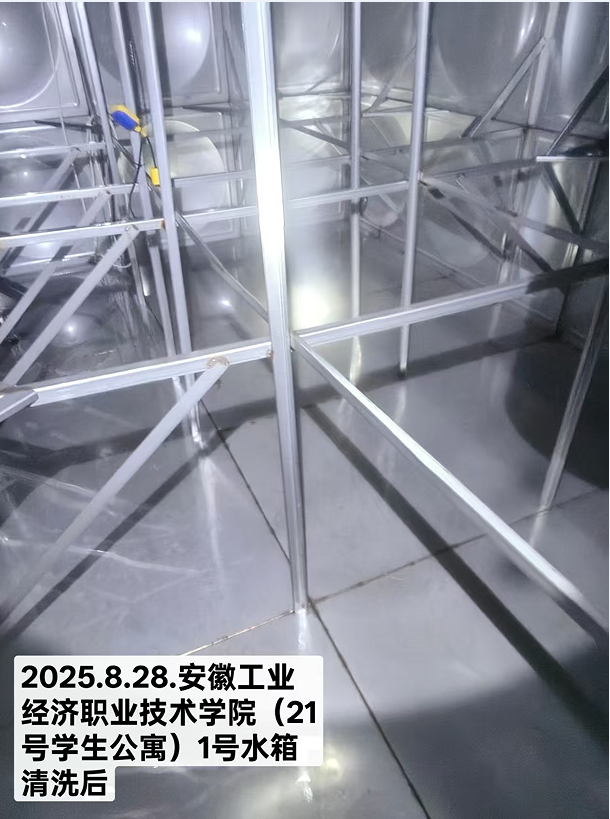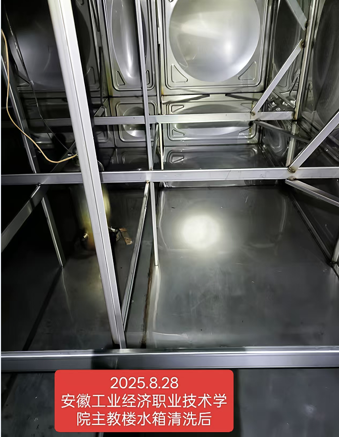 为确保学校二次供水水质符合国家《生活饮用水水质卫生规范》,保护学校师生的身体健康,总务处物业管理科按季度对全校二次供水水箱进行清洗消毒。临近开学,总务处物业管理科于2025年8月28日安排专业清洗公司对学校二次供水水箱进行全面清洗消毒。该公司具备《安全生产许可证》、《有限空间作业服务企业资质证书》、《消毒药剂卫生许可批件》和进入水箱清洗人员具备有效的健康证。