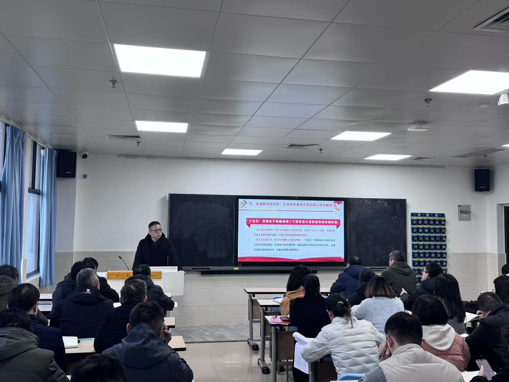 12月29日下午,党委委员、副院长吴飞以《深学笃行党的二十届四中全会精神 勇担“十五五”现代化新使命》为题讲授专题党课,文化旅游与教育学院党总支、公共教学部党总支、继续教育学院党支部、教务处党支部、图书馆党支部、总务处党支部、质量管理处全体在职党员、预备党员等60余名党员聆听党课。