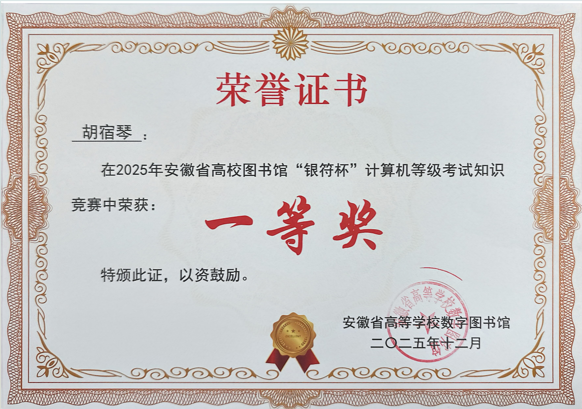 本次比赛由安徽省高等学校数字图书馆主办、北京银符信息技术有限公司承办,吸引了来自全省89所高校的近2万名学生踊跃参与,竞争激烈。依据“得分最高、时间最短”的排名规则,学院共有6名学子斩获佳绩,其中,胡宿琴同学凭借扎实的计算机知识储备在比赛中名列前茅,荣膺一等奖(全省仅10名),充分展现了学院学子优良的计算机应用能力和信息素养。
