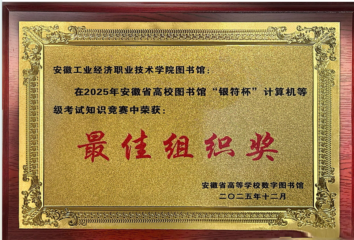 日前,2025年安徽省高校图书馆“银符杯”计算机等级考试知识竞赛结果揭晓,安徽工业经济职业技术学院共有6名学子荣获奖项,其中胡宿琴同学表现突出,荣获一等奖,白雅琛、汪瑞两位老师荣获“优秀指导教师”称号,学院图书馆被授予“最佳组织奖”。