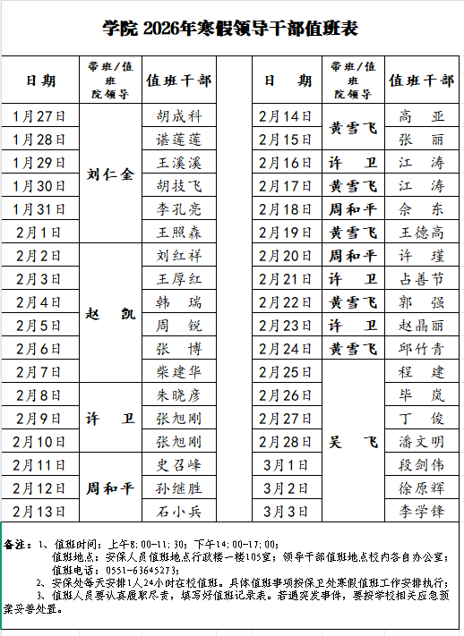 学院2026年寒假领导干部值班表
