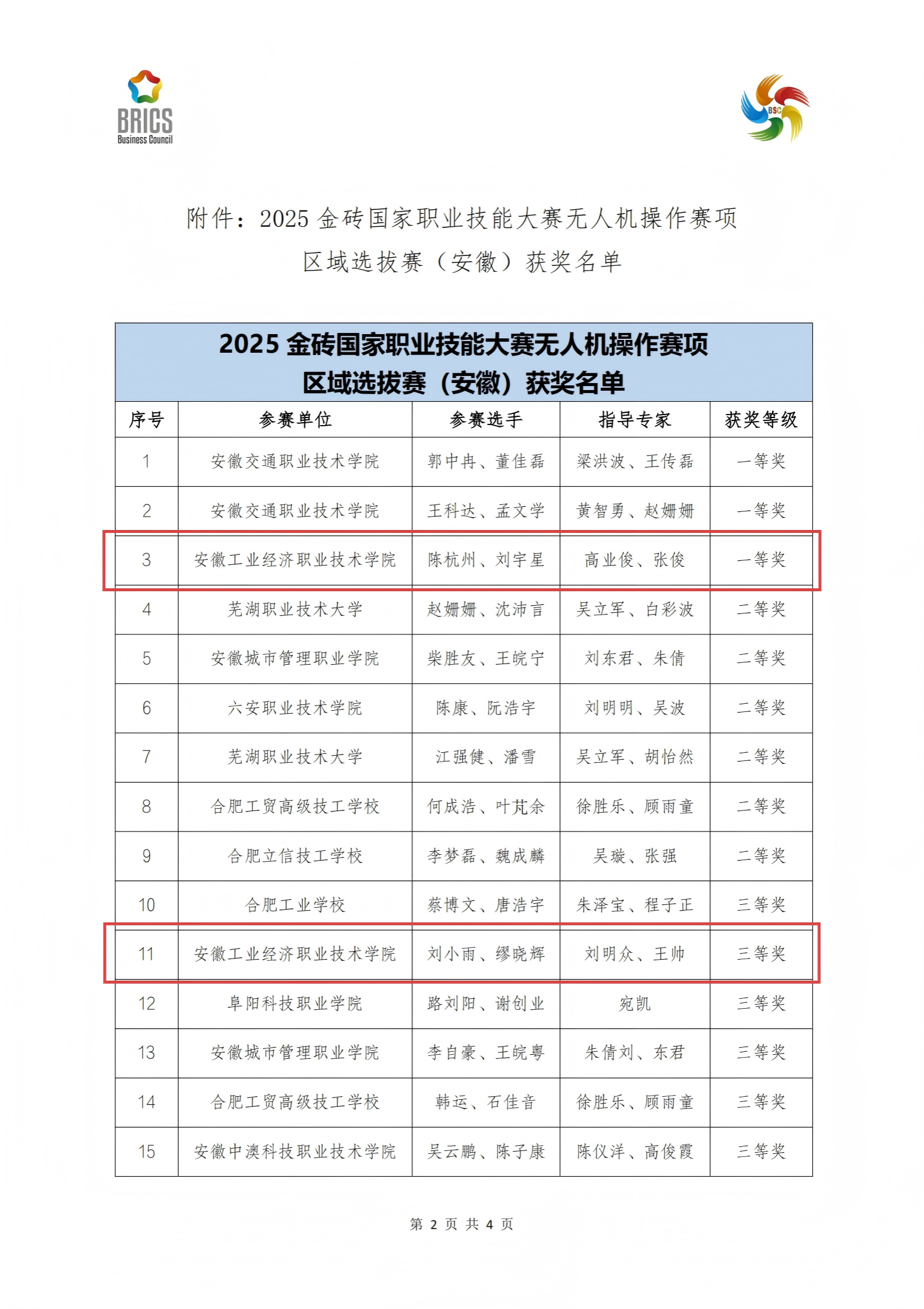 近日,2025金砖国家职业技能大赛无人机操作赛项区域(安徽)选拔赛圆满落幕。安徽工业经济职业技术学院参赛团队凭借扎实的专业技能和出色的现场发挥,在众多参赛院校中表现突出,由高业俊、张俊老师指导的陈杭州、刘宇星团队荣获一等奖并成功晋级国际总决赛,由刘明众、王帅老师指导的刘小雨、缪晓辉团队获得三等奖。