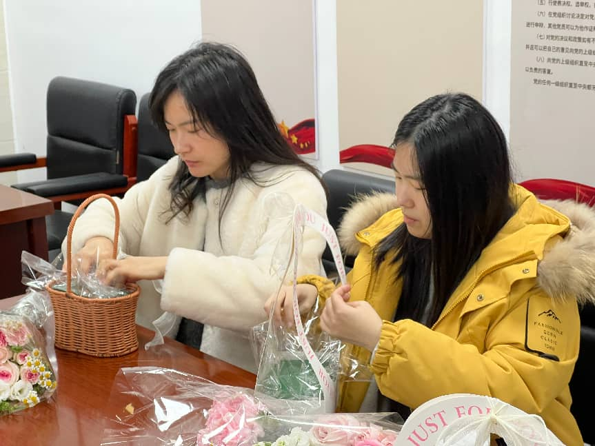 插花活动现场,玫瑰、康乃馨等花材摆放整齐,女教职工们发挥创意,精心搭配,制作出了一束束美丽的花束,尽情享受着插花带来的乐趣。分会DIY活动也热闹非凡,大家用统一发放的材料制作国风竹节包,展现出了心灵手巧的一面。