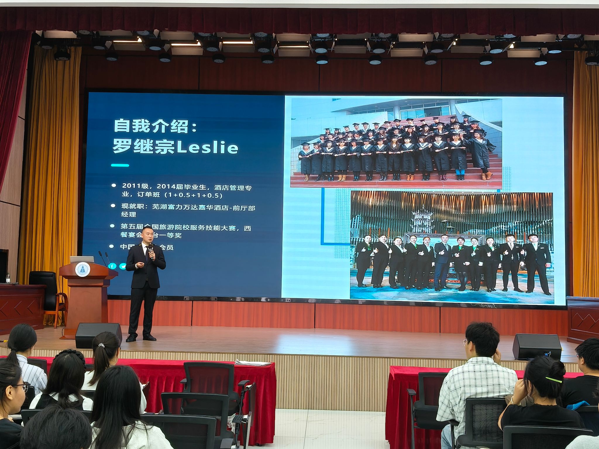学院2014届酒店管理专业优秀毕业生罗继宗,一直深耕于酒店行业,现任芜湖富力万达嘉华大酒店前厅部经理。他以“大学生职业生涯规划与发展”为主题,分享了在校期间的知识学习、竞赛参与和社会实践如何为职业生涯奠定坚实基础,并详细讲述了如何从一名基层员工逐步成长为酒店管理骨干的历程。他鼓励新生们不仅要学好专业基础知识,更要积极拥抱变化,具有主动学习意识,培养国际化视野和跨文化沟通能力。